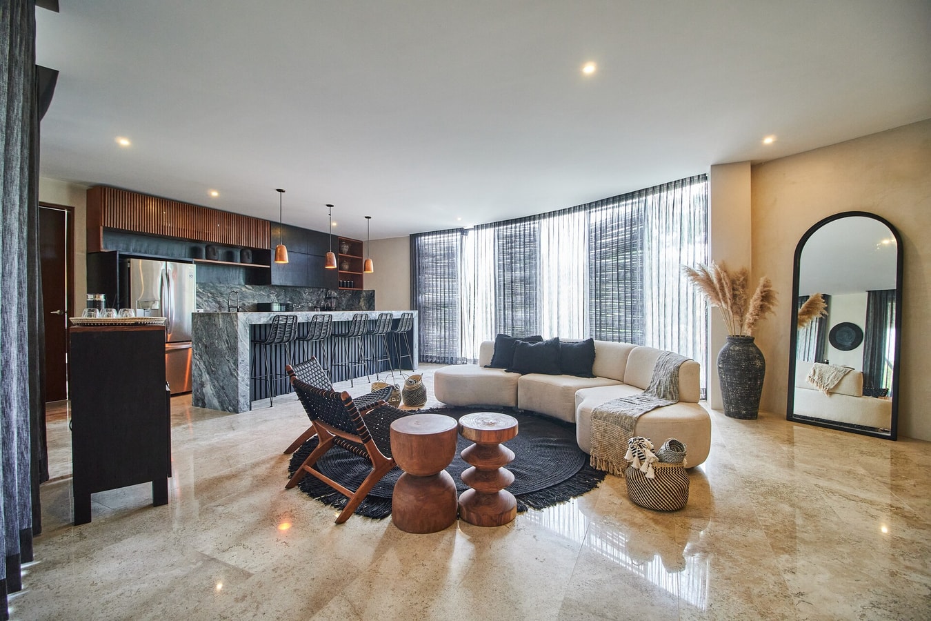 Step into a bright and inviting space designed for relaxation and connection. The open-concept living room features stylish boho-inspired furniture, warm natural tones, and a cozy atmosphere that makes you feel right at home. The fully equipped kitchen comes with everything you need—from modern appliances to cooking essentials—perfect for preparing meals and enjoying time together. A beautifully designed space where comfort meets tropical charm.