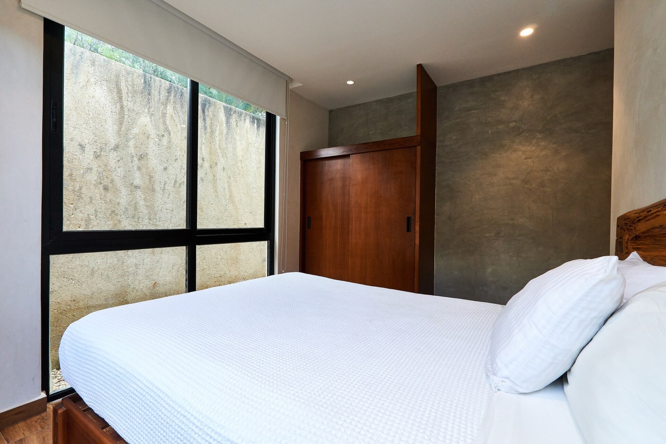 Guests enjoy the independence of their own apartment—with private entrances, bathrooms, and kitchens—while still having the opportunity to gather in the inviting living areas or relax on the stunning rooftop terrace, perfect for socializing, sunbathing, or enjoying the Tulum sunsets together.